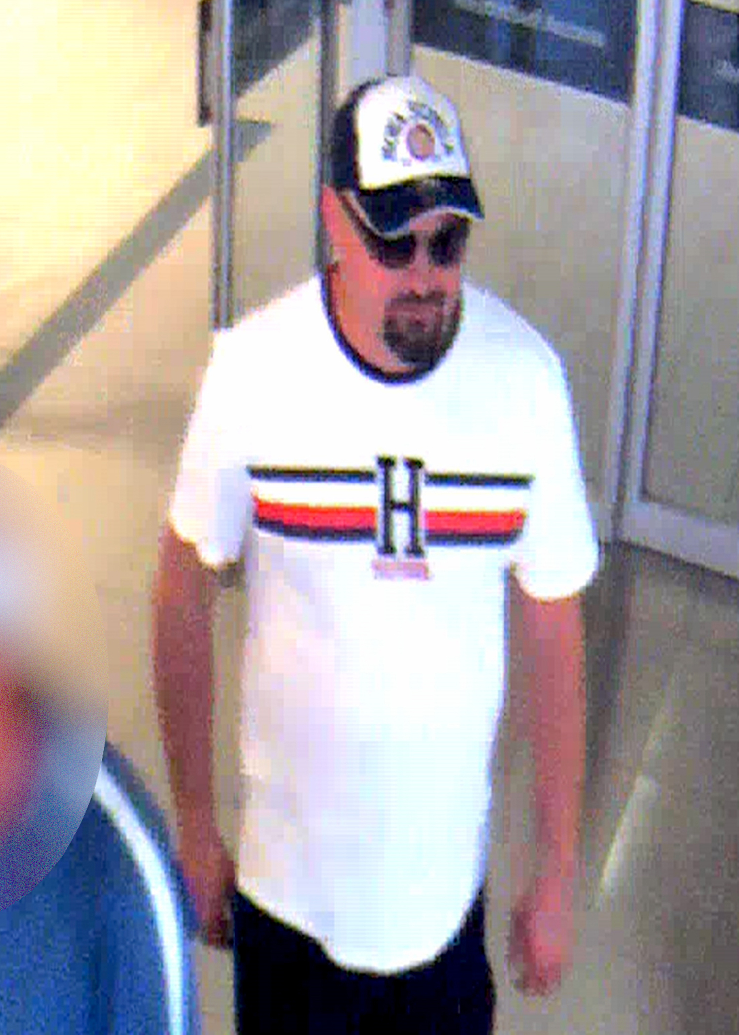 At the time of the incident, he was wearing a white t-shirt, black shorts, a baseball cap, sunglasses and sneakers.