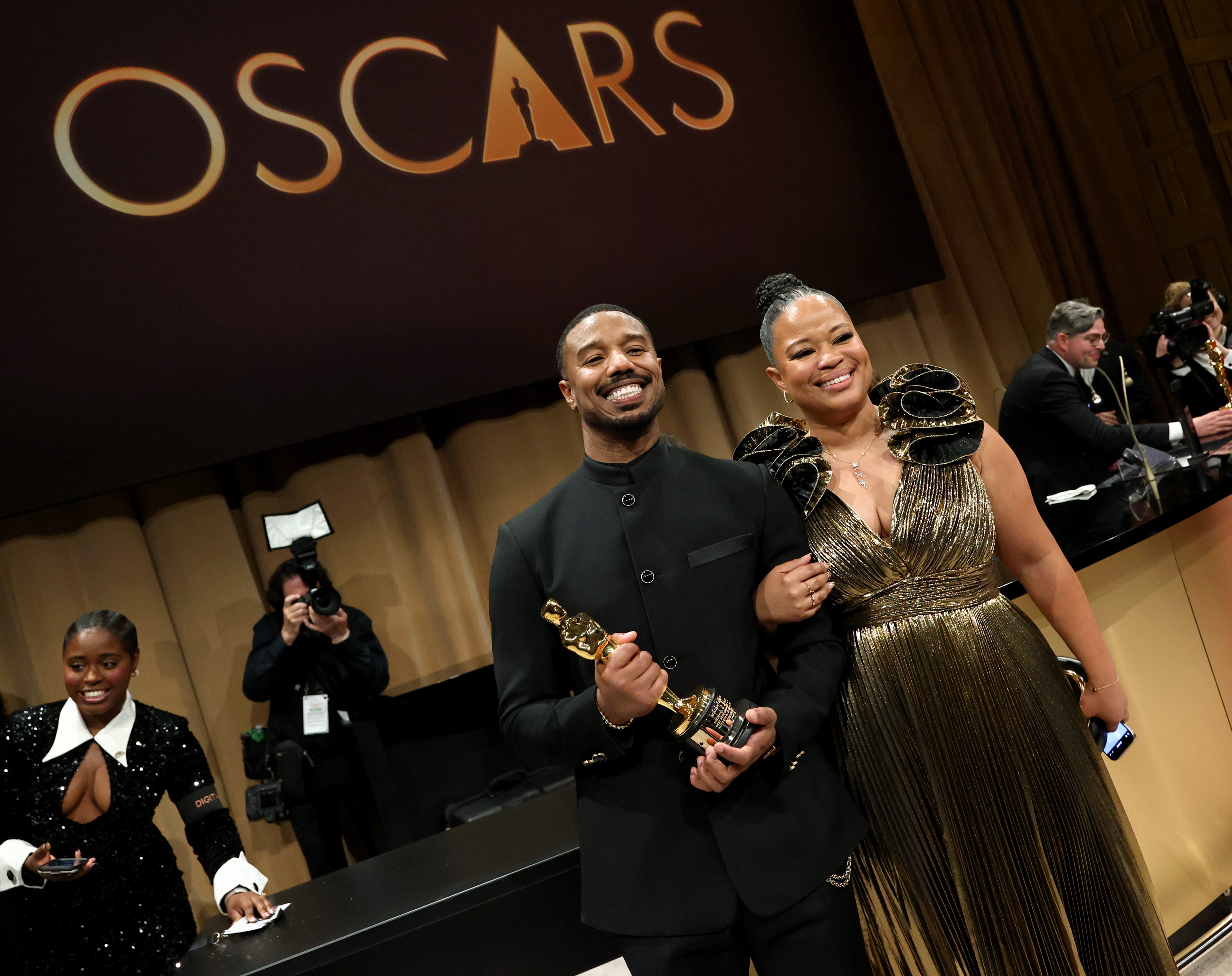 The actor rushed to her, the two sharing a 10-second embrace as flashes erupted around them. Jordan-Theus cackled as they rocked back and forth, and Jordan tucked her arm into his so they could witness his first Oscar win become cemented in Academy Awards history.