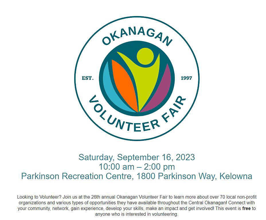 The Okanagan Volunteer Fair will take place on Saturday, 10 a.m. to 2 p.m., at the Parkinson Rec Centre.