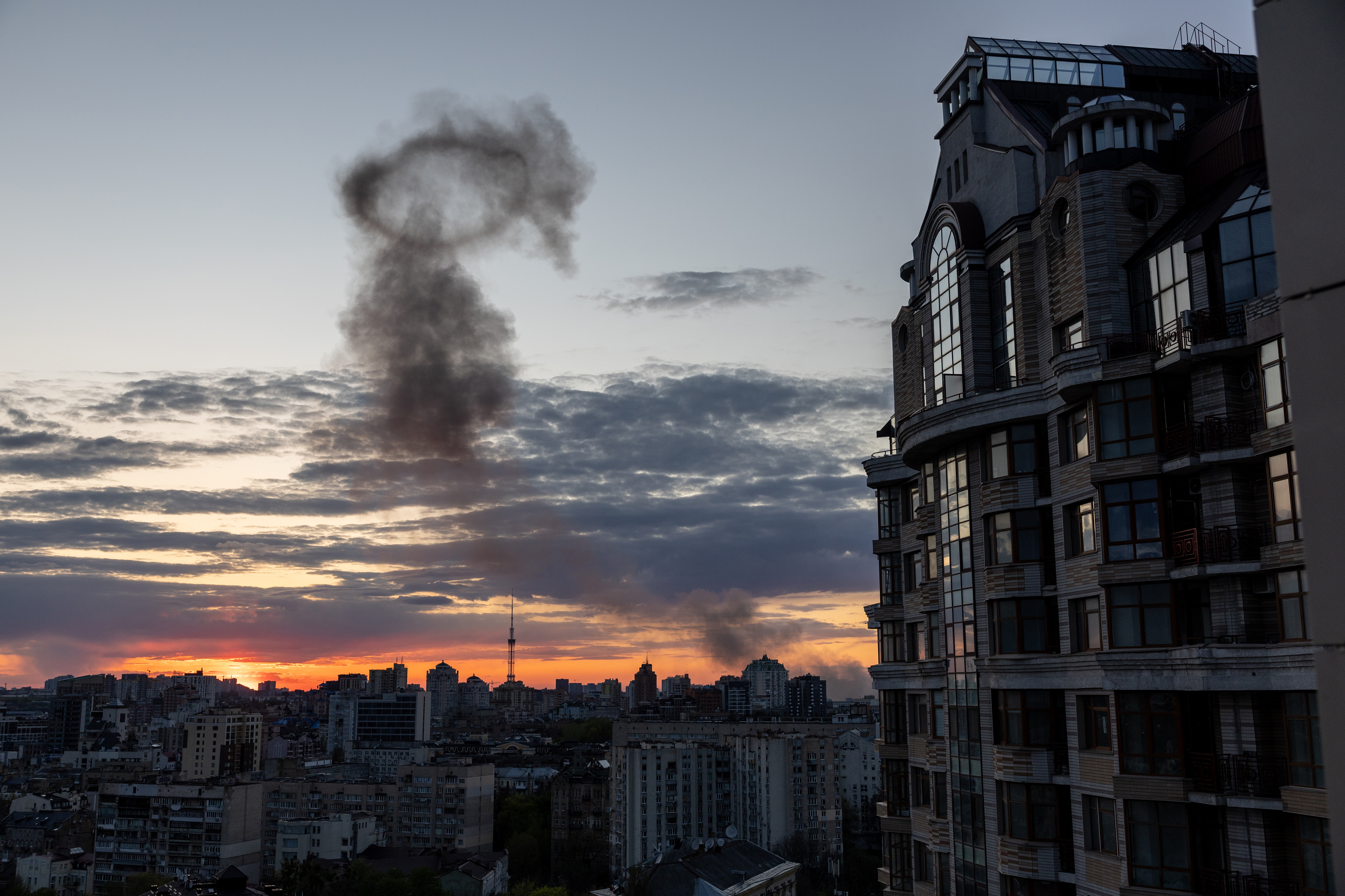 The explosions, which Kyiv Mayor Vitali Klitschko said took place in the Shevchenkivskyi district near the city centre at about 8 p.m. local time, sent large plumes of black smoke into the air.