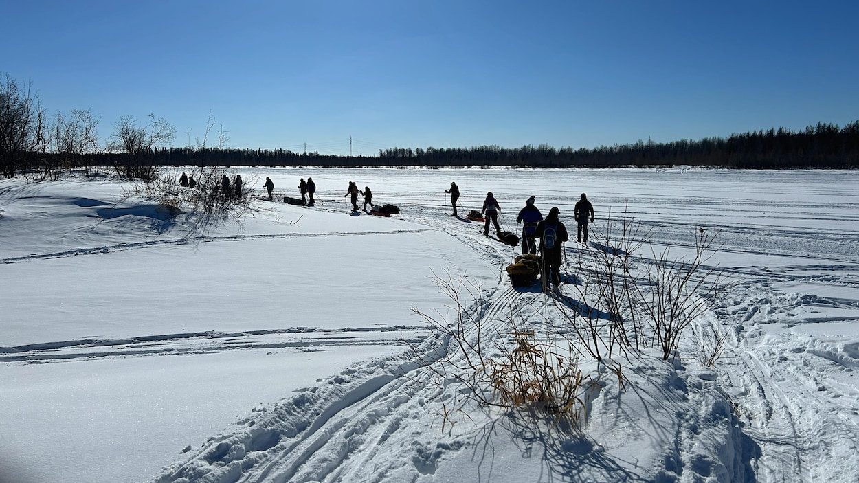 La fébrilité était dans l’air à la Marina en fin d’avant-midi jeudi. Les organisateurs sont arrivés sur leur ski de fond avec leurs traîneaux contenant des vêtements de rechange, de l’eau et de la nourriture. Quelques minutes après eux arrivait l’autobus qui transportait une cinquantaine d’élèves de l’école secondaire d’Amos. Sitôt sortis, ils ont ajusté leur équipement et se sont lancés sur la rivière Harricana gelée. Éric Dupras, Marine Claracq et Véronique Samuel-Thomassin, des médecins à Amos, participent au Double défi des deux Mario pour la traversée du lac Saint-Jean depuis quelques années. C’est une activité de levée de fonds avec des places limitées et, cette année, c’était rempli. On a dit : "On va en profiter pour faire un événement ici", souligne Éric Dupras. Éric Dupras, Marine Claracq et Véronique Samuel-Thomassin ont fait quelques mètres en ski de fond avant le départ officiel pour ajuster leur équipement et leurs vêtements.