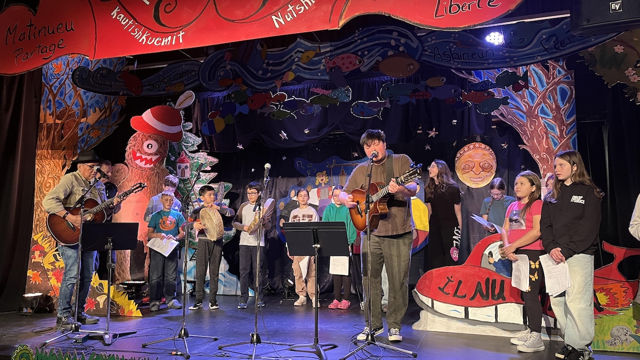 Des élèves de Saint-Prime et de Mashteuiatsh, au Lac-Saint-Jean, présenteront mercredi soir au Vieux Couvent un spectacle qu'ils ont créé au cours des derniers mois en compagnie d'artistes professionnels, dont Émile Bilodeau et Pako. Le projet artistique Mamu Assihtsh, qui signifie « ensemble sur le territoire », a pour but de tisser des liens entre les jeunes de ces communautés. Depuis janvier, près de 140 élèves de cinquième et sixième année des écoles Amishk de Mashteuiatsh et Jeanne-Mance de Saint-Prime ont participé à chacune des étapes de la création d'un spectacle unique, allant de l’écriture des textes jusqu’à la conception des décors. Le projet unit les élèves des écoles Jeanne-Mance de Saint-Prime et Amishk de Mashteuiatsh et vise à tisser des liens entre les communautés. Photo : Radio-Canada / Andréanne Larouche