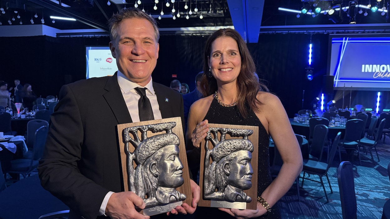 L'associé leader de marché de Mallette en Mauricie et président du conseil d’administration du comité organisateur de la 59e Finale des Jeux du Québec à Trois-Rivières, Martin Leblanc, ainsi que la directrice générale du Groupe Doyon, Véronique Doyon, sont les personnalités de l’année du 41e Gala Radisson. Les sourires étaient larges et l’émotion, palpable, jeudi soir, après la remise des prix aux deux personnalités, qui ont été chaleureusement saluées et applaudies par la communauté d’affaires trifluvienne rassemblée au Centre d’événements et de congrès interactif (CECi) de Trois-Rivières. Ça a été une année exceptionnelle avec les Jeux du Québec, mais depuis 30 ans que je m'implique dans ma communauté, on dirait que c'est comme une forme de consécration du moment, a confié le gagnant du prix hommage Personnalité masculine, Martin Leblanc, qui a qualifié son expérience aux Jeux du Québec comme l’une des plus grandes de sa vie professionnelle. De le vivre avec toute la communauté d'affaires, avec mes associés, avec les gens avec qui je partage… C'est un grand moment pour moi. L’engagement de Martin Leblanc dans la communauté a été reconnu par les gens d’affaires de Trois-Rivières. (Photo : 26 février 2026) Photo : Radio-Canada / Katy Cloutier