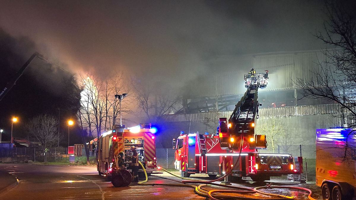 In Karlsruhe fängt eine Lagerhalle Feuer. Die Flammen lassen einen Teil des Gebäudes einstürzen. Der Schaden ist immens.
