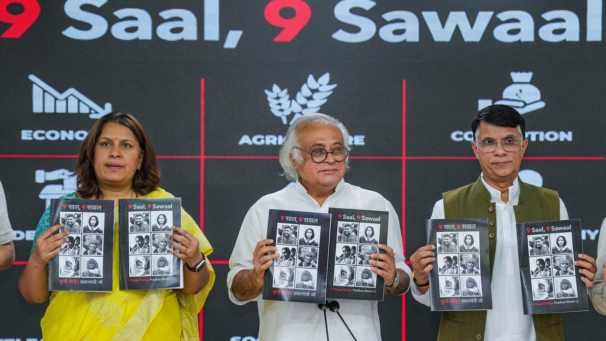 Mr. Ramesh, who was flanked by party leaders Pawan Khera and Supriya Shrinate, also released a booklet ‘Nau saal, Nau sawaal’ and said Mr. Modi had become the Prime Minister on this day nine years ago and therefore, the party wants to ask nine questions of him. “We want the PM to break his silence on these nine questions,” Mr. Ramesh said.