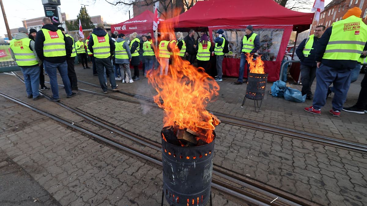 Die Tarifverhandlungen im ÖPNV im Nordosten laufen seit Stunden. Begleitet wurden sie von Warnstreiks in Rostock. Bislang gibt es keine Verständigung.