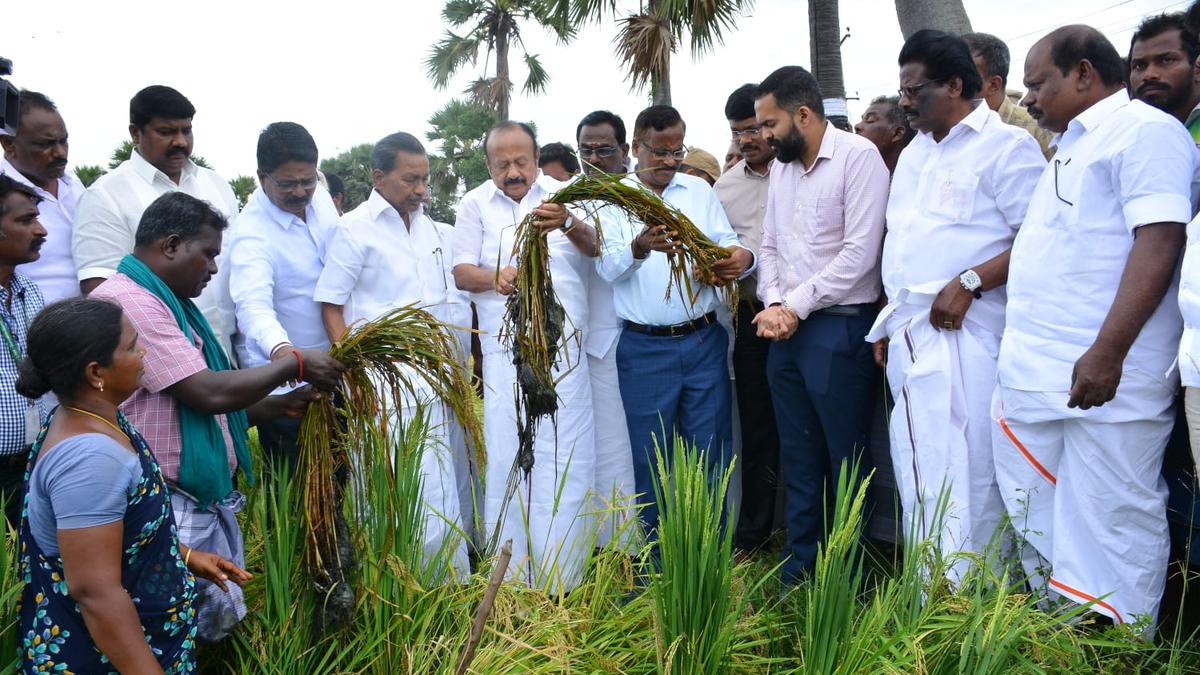 Minister M.R.K. Panneerselvam inspects flood-affected paddy fields in Nagapattinam, assessing damage and initiating relief measures.