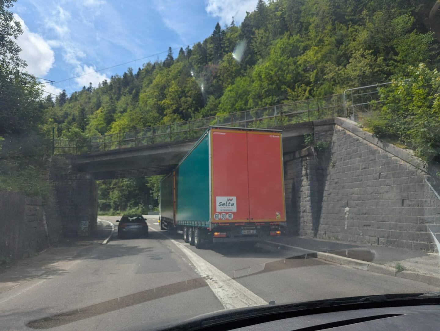 Les automobilistes sont depuis contraints d’utiliser des voies de contournement, dont l’une passe sous le Pont des Rosiers. Or, ce dernier ne fait que 3,90 mètres de hauteur, et bien que de la signalisation a été mise en place pour empêcher des véhicules trop haut de passer par là, plusieurs poids lourds tentent la manœuvre... et le regrettent amèrement.