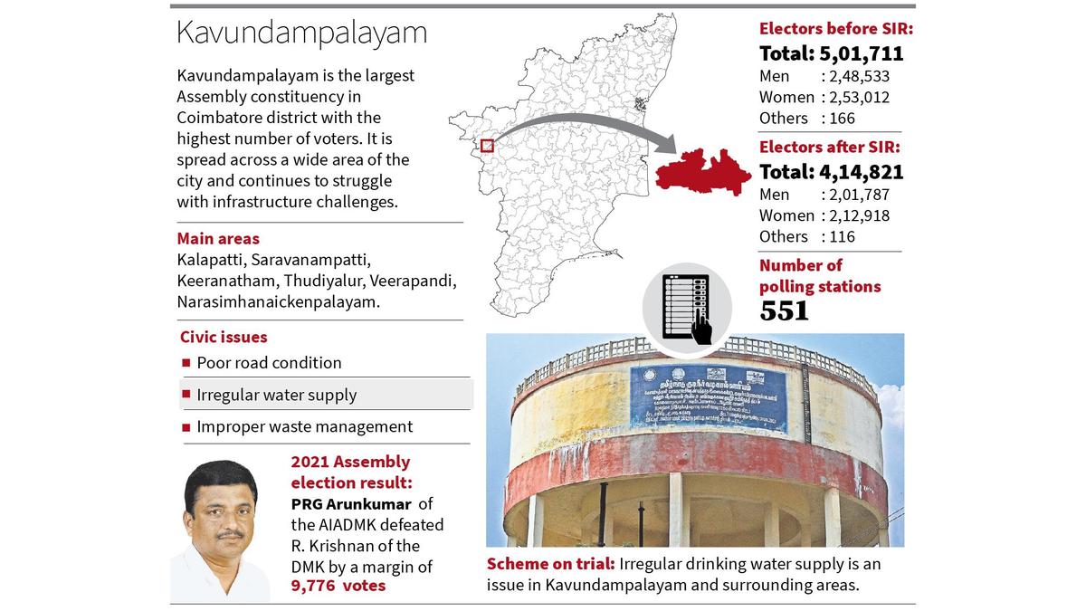 The Assembly constituency that has the highest number of voters in Coimbatore district, Kavundampalayam covers the IT hub of Coimbatore - Saravanampatti, Narasimhanaikenpalayam, Thudiyalur, and Kalapatti. Having elected an AIADMK MLA in the last three Assembly elections, it goes to polls this year with contestants from the Congress, the AIADMK, the NTK, and the TVK.