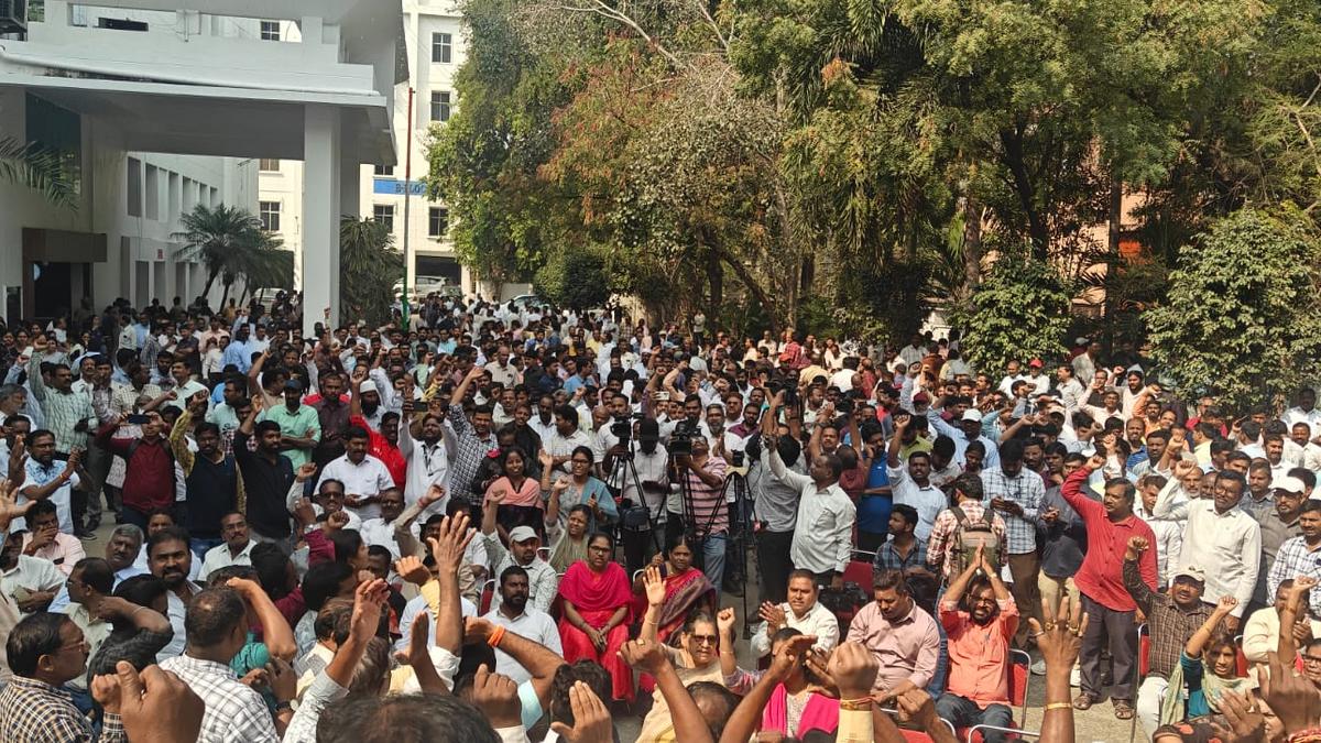 Telangana power employees protest for long-pending demands, including transfer guidelines and minimum service conditions, at TGSPDCL headquarters.
