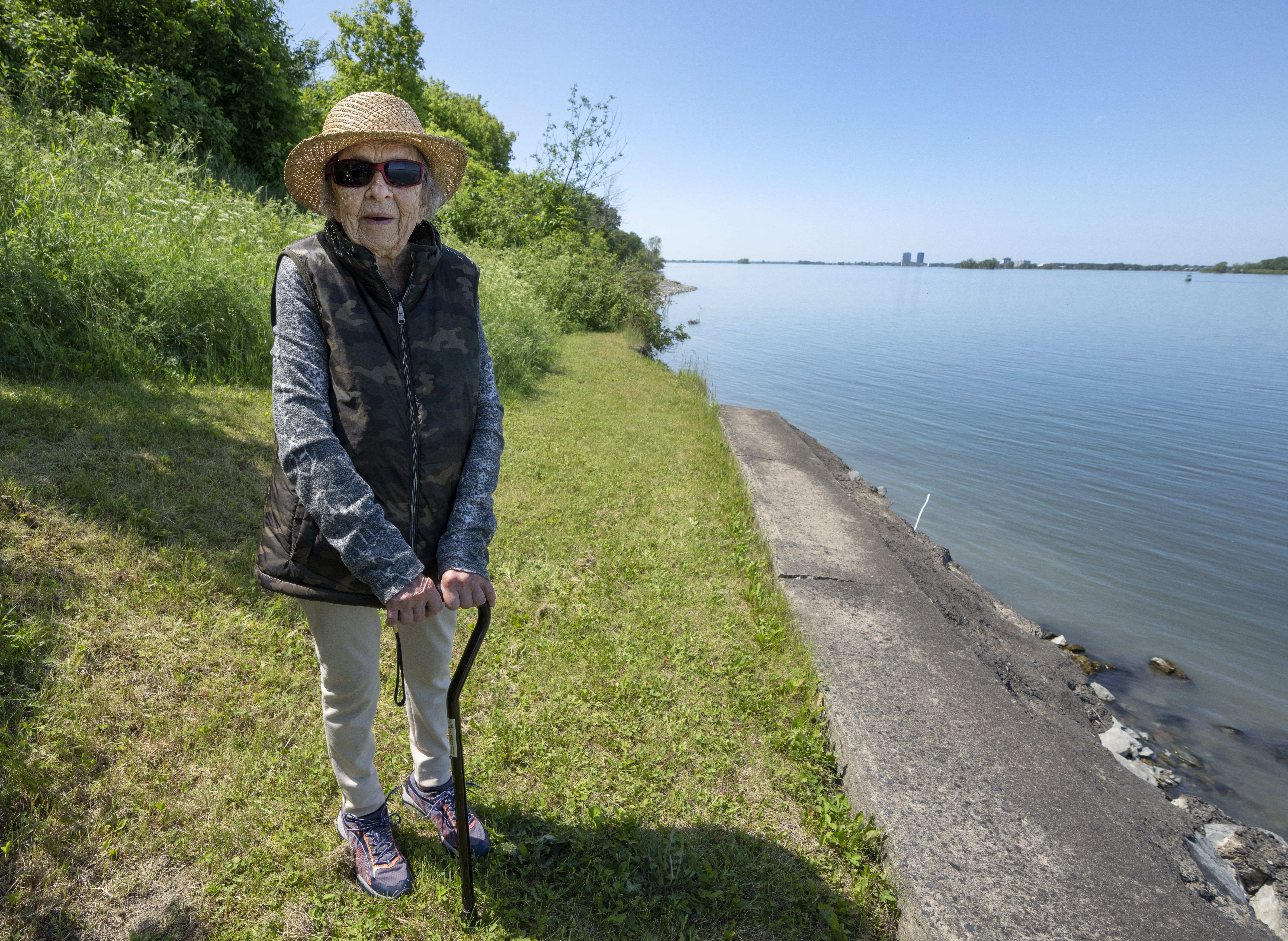 Despite her age, she made the steep hike down the slope to the river, wearing a straw hat and sunglasses, with the help of a cane. At the bottom, she pointed to places where the water has carved bays into the shore since her last visit.