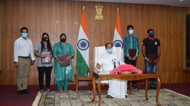 Rajya Sabha Chairman M Venkaiah Naidu handed over the cheques of Rs 3.5 lakhs to each of the kin of the officials of the secretariat who died during the second Covid wave. The contribution was made by the staff of Rajya Sabha.