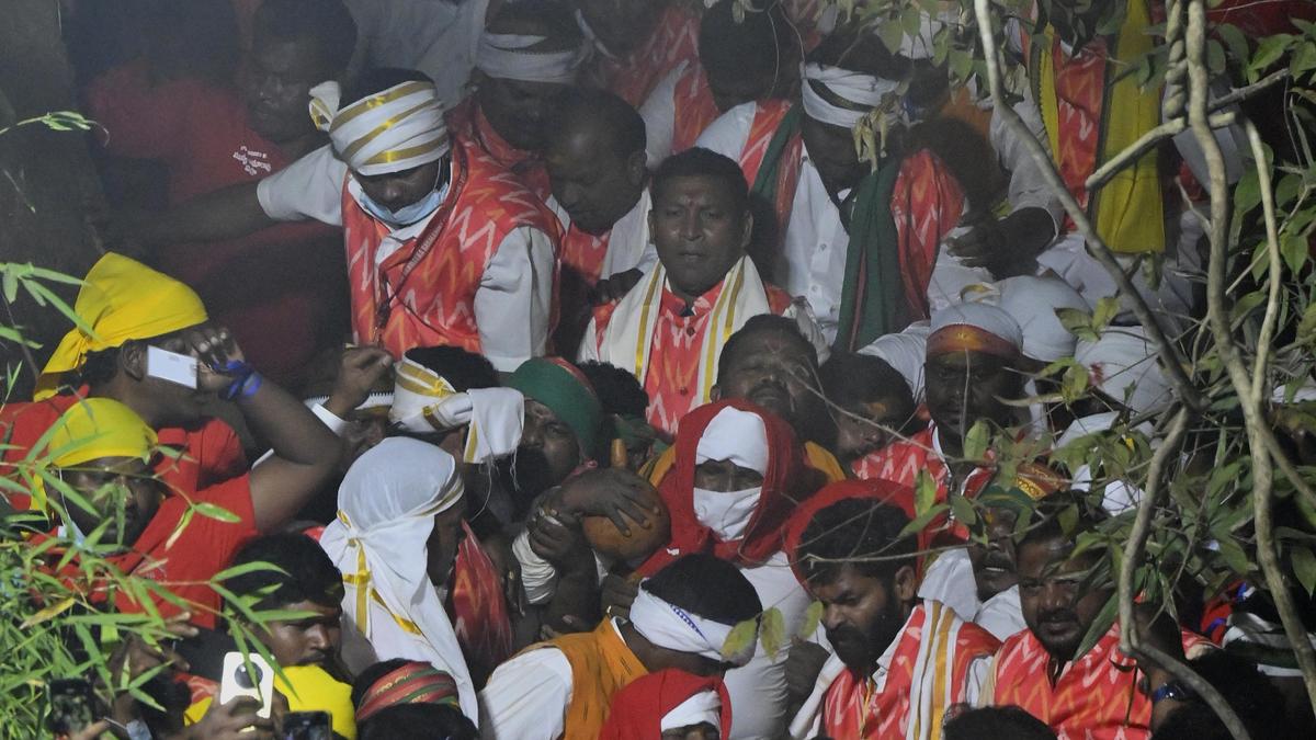 Amid a three-layer security cover, Mother Sammakka, brought in the form of a vermillion casket by a team of Koya priests from the Chilakalagattu hillock, was ceremonially placed on her Gadde (sacred platform) at the Medaram tribal shrine at 9.45 p.m on Thursday (January 29). Her arrival marked one of the most significant moments of the four-day biennial Sammakka–Saralamma Maha Jatara, which began on Wednesday (January 28).