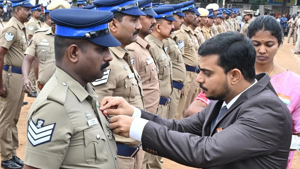 Mr. Giriyappanavar, along with other officials, released tricolour balloons and white pigeons into the air. The Collector honoured family members of eight freedom fighters and three Tamil language martyrs (Tamil Mozhi Thiyagigal). He presented Chief Minister’s medals and certificates of appreciation to 122 police personnel, certificates to 30 heads of government departments, 34 revenue officials and 127 officials from other departments including, doctors and administrative staff.