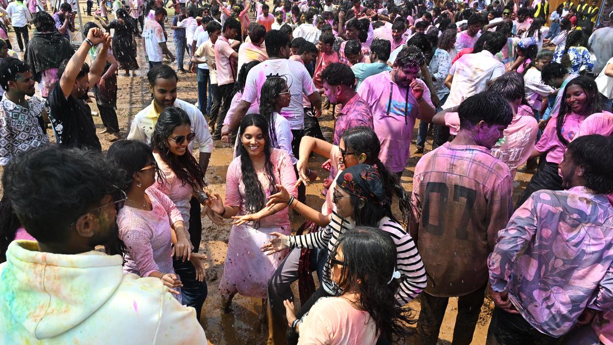 Youngsters enjoy playing with colours to celebrate Holi and rain dance in Visakhapatnam on Wednesday. | Photo Credit: V. RAJU