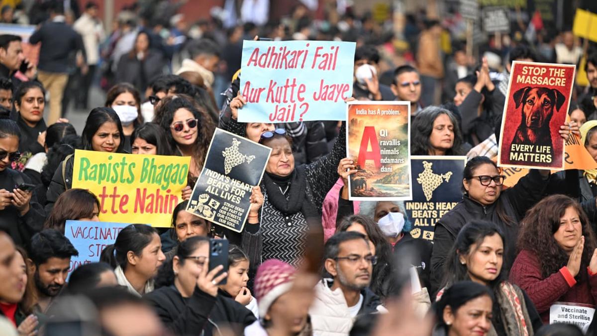 Activists and citizens protest in Delhi, demanding humane policies for stray dogs ahead of a Supreme Court hearing.