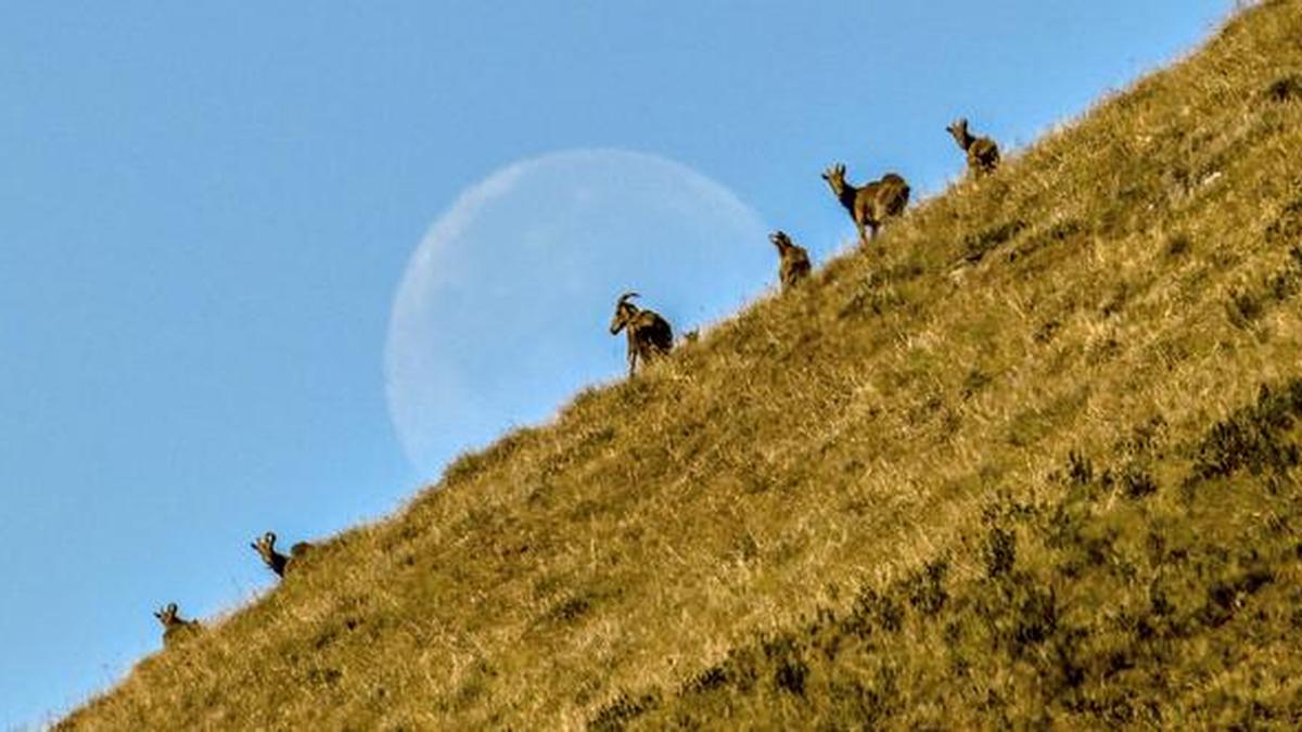 A small herd of Nilgiri Tahr grazing on the grasslands of the Nilgiris beneath a fading morning moon.