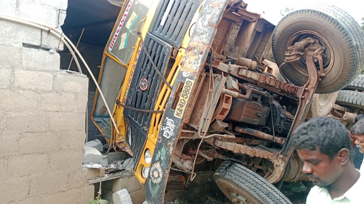 The truck was heading from Chintamani to Kolar when the driver lost control and crashed into the roadside hotel. The truck toppled as the walls crumbled and the roof of the hotel fell on the truck. While there were many people standing near the hotel and an adjacent shop, they all jumped to safety.