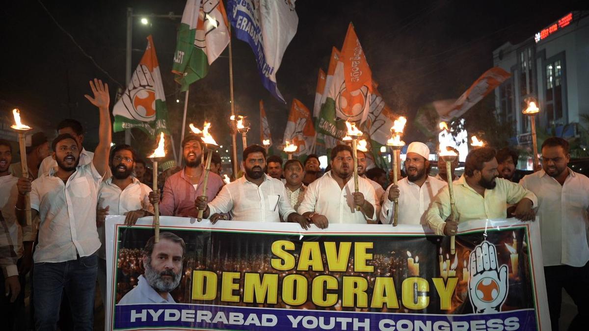 The Hyderabad Youth Congress organised “Save Democracy Torch Rally” in Amberpet on Wednesday protesting against the disqualification of Rahul Gandhi from the Parliament. The Youth Congress members led by the city unit president, Motha Rohit carried torches and a banner and went in a rally raising slogans against the BJP government. Mr. Rohit said the Youth Congress will not rest until the ‘fascist’ government of the BJP is brought down for killing democracy in the country. “We are with Rahul Gandhi and we want him to lead the fight against the BJP,” he said.